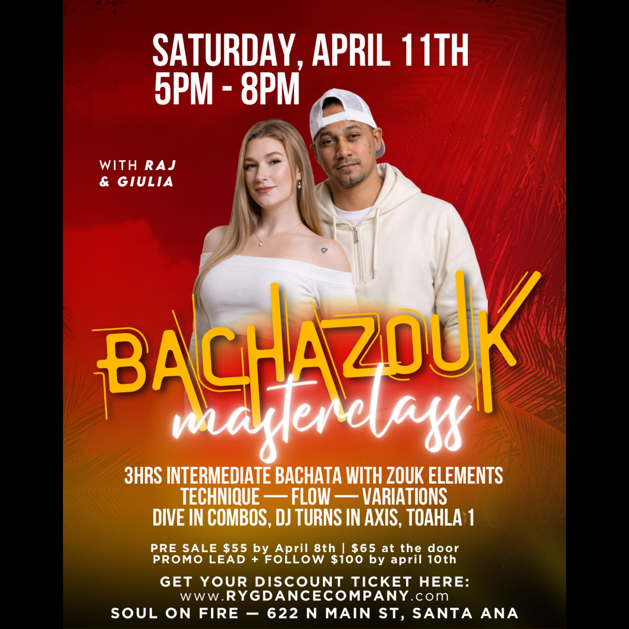 Events & Social Events & Social Clear Filters Filter Clear Filter SANTA ANA/OC — Saturday April 11th — 3hrs BachaZouk Workshop — 5pm Sale Price: $55.00 Original Price: $65.00 Sale Add To Cart Added! PROMO LEAD + FOLLOW — SANTA ANA/OC — 3hrs BachaZouk Masterclass — Saturday April 11th Sale Price: $100.00 Original Price: $130.00 Sale Add To Cart Added! RYG SOCIAL — Saturday April 18th — 100% BACHATA & 100% SALSA — full pass Sale Price: $10.00 Original Price: $20.00 Sale Add To Cart Added! RYG SOCIAL — Saturday May 2nd — 100% SALSA & 100% BACHATA — full pass Sale Price: $10.00 Original Price: $20.00 Sale Add To Cart Added! RYG SOCIAL — Saturday May 16th — 100% Bachata & 100% Salsa — full pass Sale Price: $10.00 Original Price: $20.00 Sale Add To Cart Added! DJ RAJ’s BDAY BASH — Saturday May 30th — full pass Sale Price: $15.00 Original Price: $25.00 Sale Add To Cart Added! BACHATA SOCIAL with Cornel & Rithika — Saturday June 13th $25.00 Add To Cart Added! JACK & JILL COMPETITOR TICKET — Saturday June 13th $50.00 Lead Follow Add To Cart Added! BOLLYWOOD PARTY & BACHATA SOCIAL — Sunday June 14th $25.00 Add To Cart Added! No results found No results match your search. Try removing a few filters.